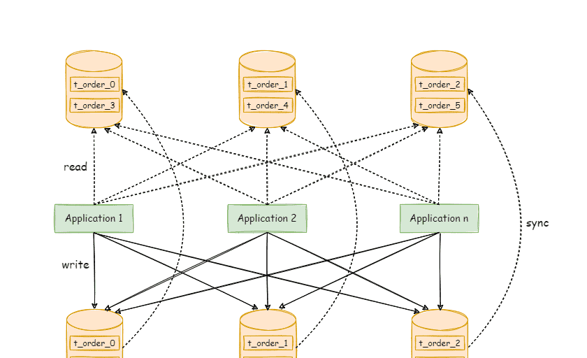 下图展现了将数据分片与读写分离一同使用时,应用程序与数据库集群之间的复杂拓扑关系。