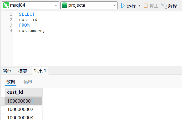 在我们的结果块内有消息、摘要、结果三个信息块,给出了表运行时长、查询出了几条数据、时间戳等重要信息。多次运行发现列表结果返回的顺序各不相同,如果没有明确的排序查询结果,返回的数据也没有特定的顺序,此时我们查看数据查询是否正确只需查看是否有相同的行数。上述查询返回的所有行数据没有过滤和排序,之后讲到具体过滤排序方式会深入讲解。