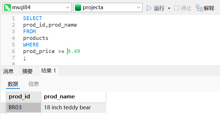 2、编写SQL语句,从Products表中检索产品ID(prod_id)和产品名称(prod_name),只返回价格为9.49美元或更高的产品。