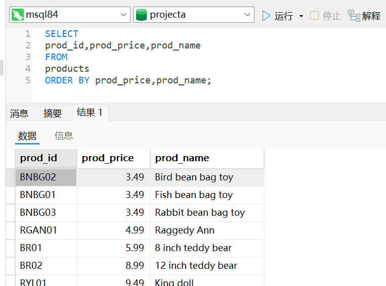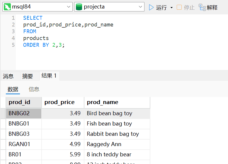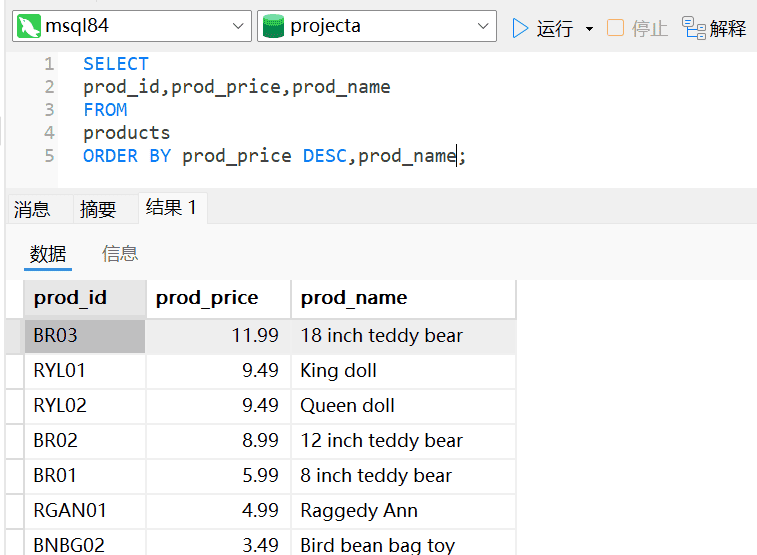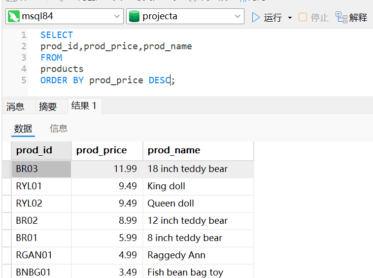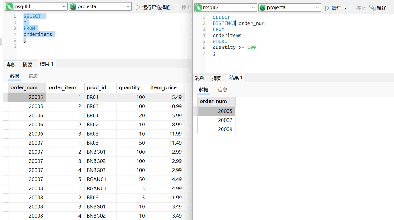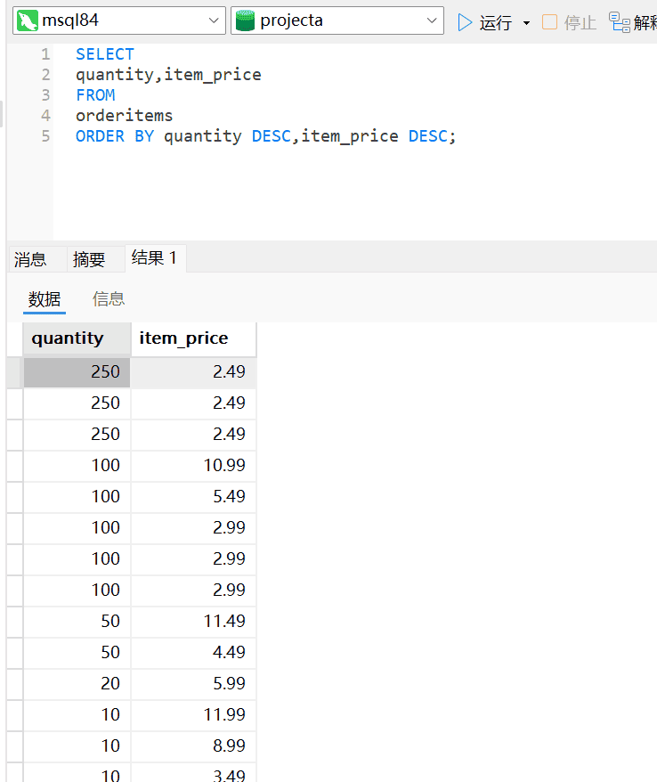 分析:首先我们要看下表OrderItems中有哪些列和数据的样式,使用通配符*。数量多少是列quantity的数据。数量由多到少和价格由高到低排序均是降序