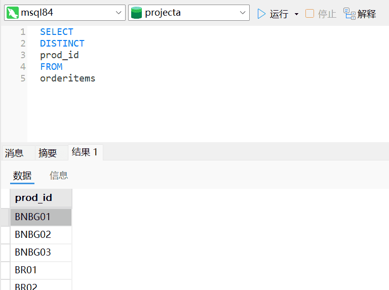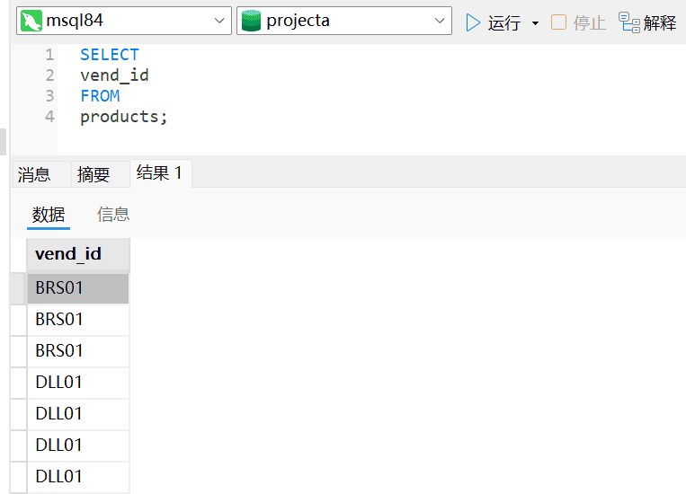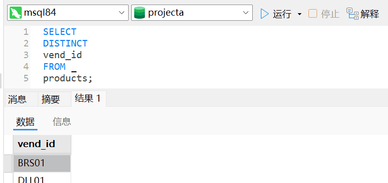 注意:DISTINCT作用于所有列,不仅仅是跟在其后面的那一列。如果是vend_idhe prod_price两个列,则单个列中也会出现重复的数值,因为