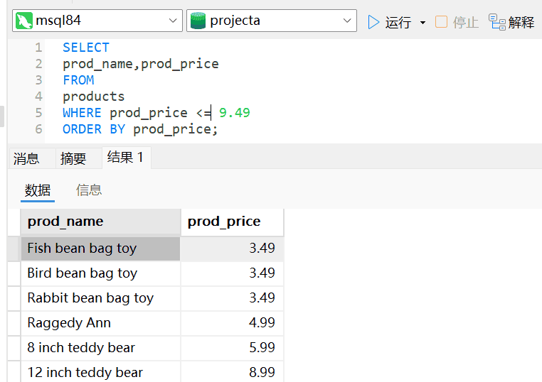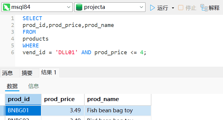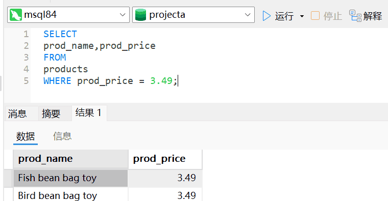 这条语句从products表中检索两个列,但不返回所有行,只返回prod_price值为3.49的行。这个示例使用了简单的相等检验:检察某一列的值是否为指定值,