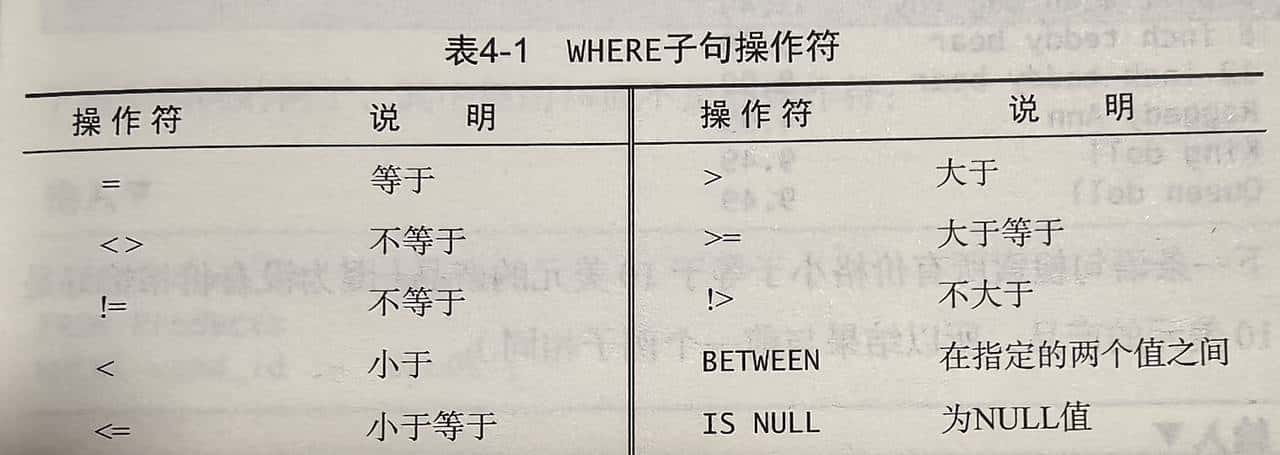 注意:上述表中所列出操作符是冗余的,例如<>与!=相同都是不等于,!<相当于>=等逻辑意义相等。而且不是所有DBMS均支持所有上述操作符,具体以使用的DBMS使用文档查看支持哪些操作符。