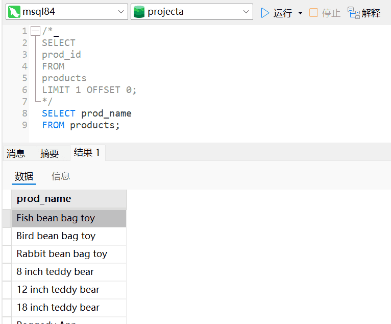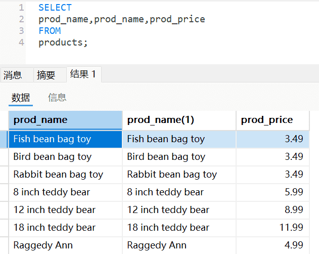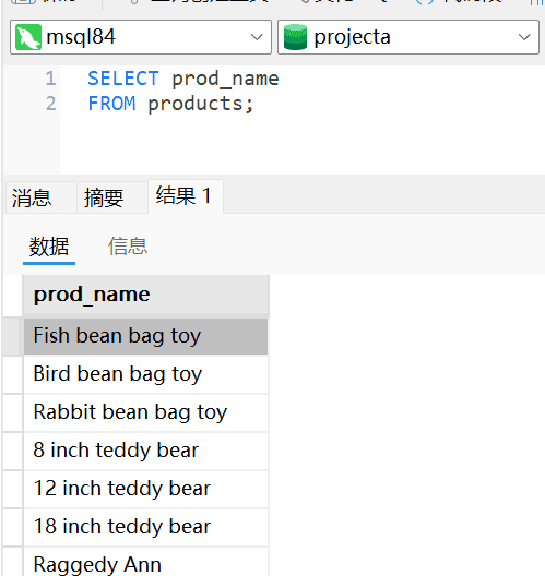 FROM `Products`; ##从Products表中检索一个名为prod_name的列。符合想选择什么从什么地方选择两条信息。