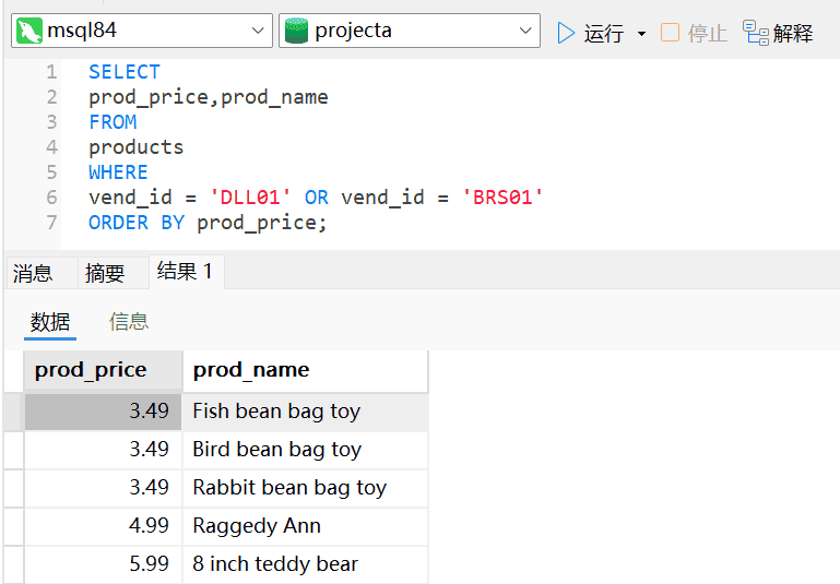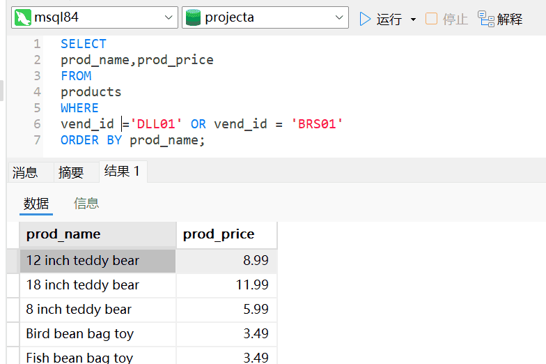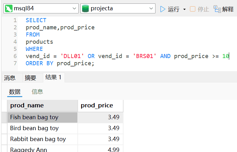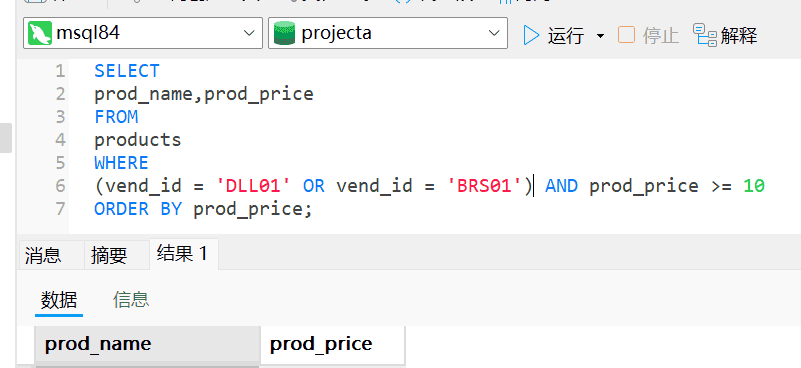 上述返回的结果行中4行价格小于10美元,返回结果未达到预期。因为AND操作符的优先处理使得服务器理解为BRS01 生产的价格为10美元以上的所有产品,以及由供应商DLL01制造的所有产品,而不管其价格是多少了。AND在求值过程中优先级更高,操作符被错误组合了。这种问题的解决办法是使用圆括号对操作符进行明确分组,如下图: