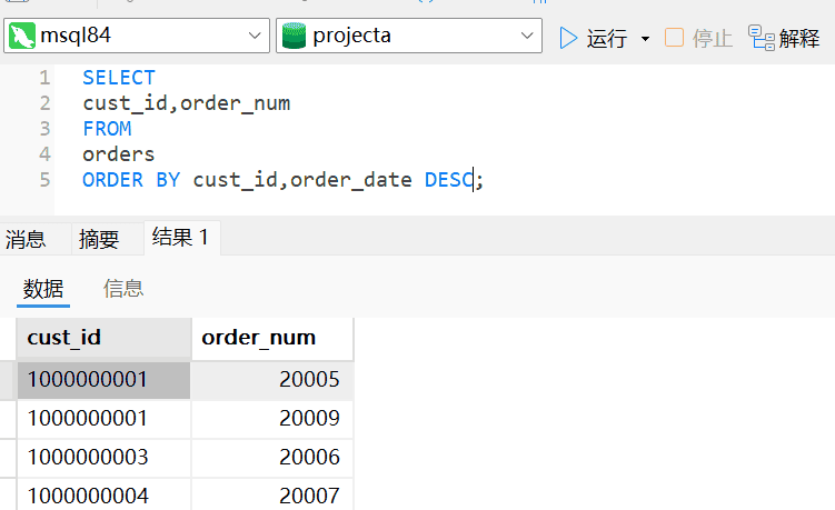 2、编写SQL语句,从Orders表中检索顾客ID(cust_id)和订单号(order_num),并先按顾客ID对结果进行排序,再按订单日期倒序排列。