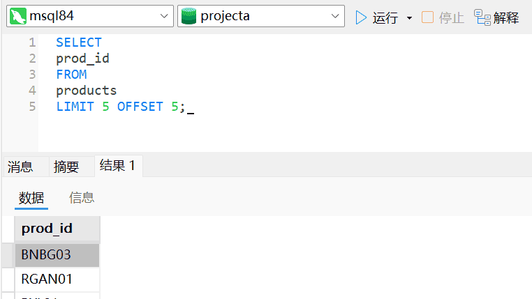 LIMIT指定返回的行数,LIMIT带的OFFSET指定从哪儿开始。在我们的例子中products表只有9行数据,所以LIMIT 5 OFFSET 5只返回了4行数据。