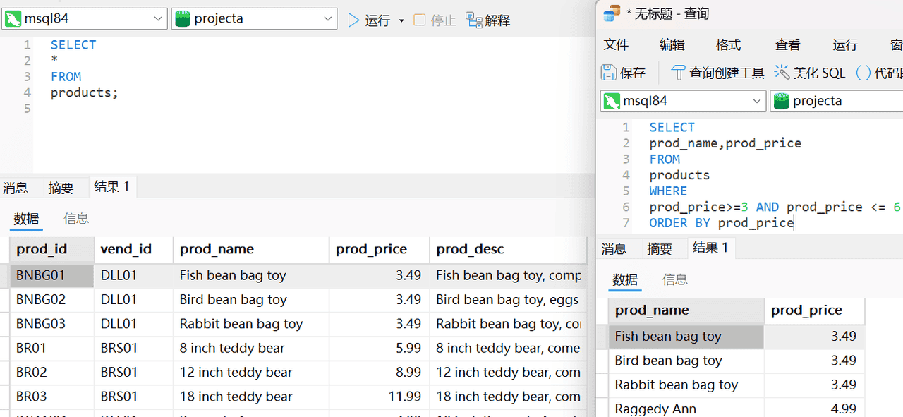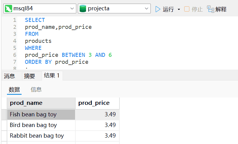 3、现在,我们回顾上一课的挑战题。编写SQL语句,返回所有价格在3美元到6美元之间的产品的名称(prod_name)和价格(prod_price)。使用AND,然后按价格对结果进行排序。