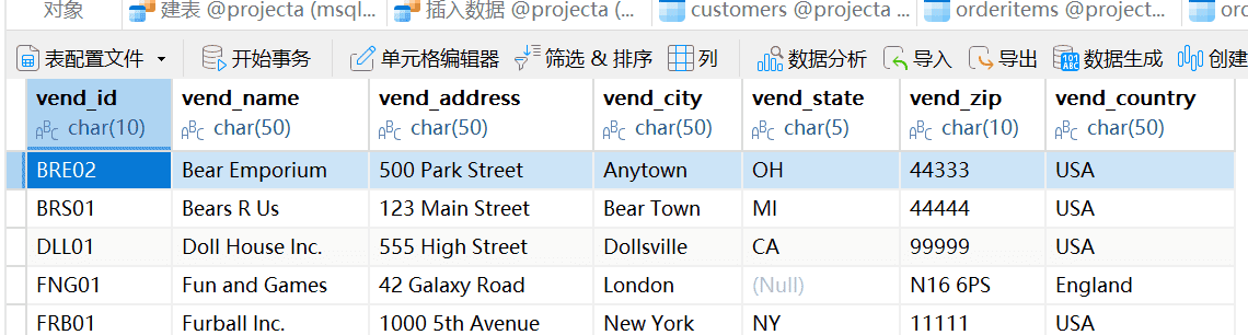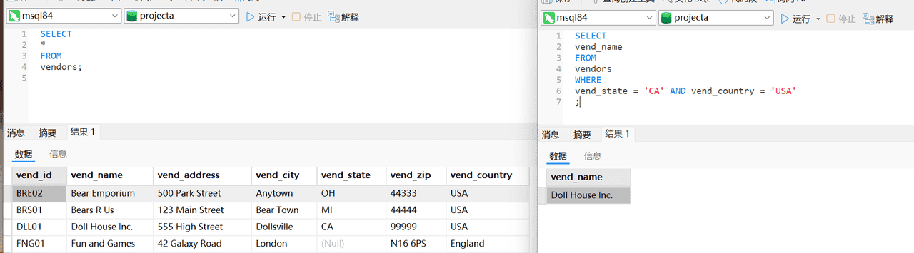 1、编写SQL语句,从Vendors表中检索供应商名称(vend_name),仅返回加利福尼亚州供应商(这需要按国家【USA】和州【CA】进行过滤,没准其他国家也存在一个加利福尼亚州)。提示:过滤器需要匹配字符串。