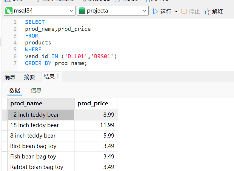 4、IN的最大优点是可以包含其他SELECT语句,能够更动态的建立WHERE子句。(第11章会对此详细介绍)