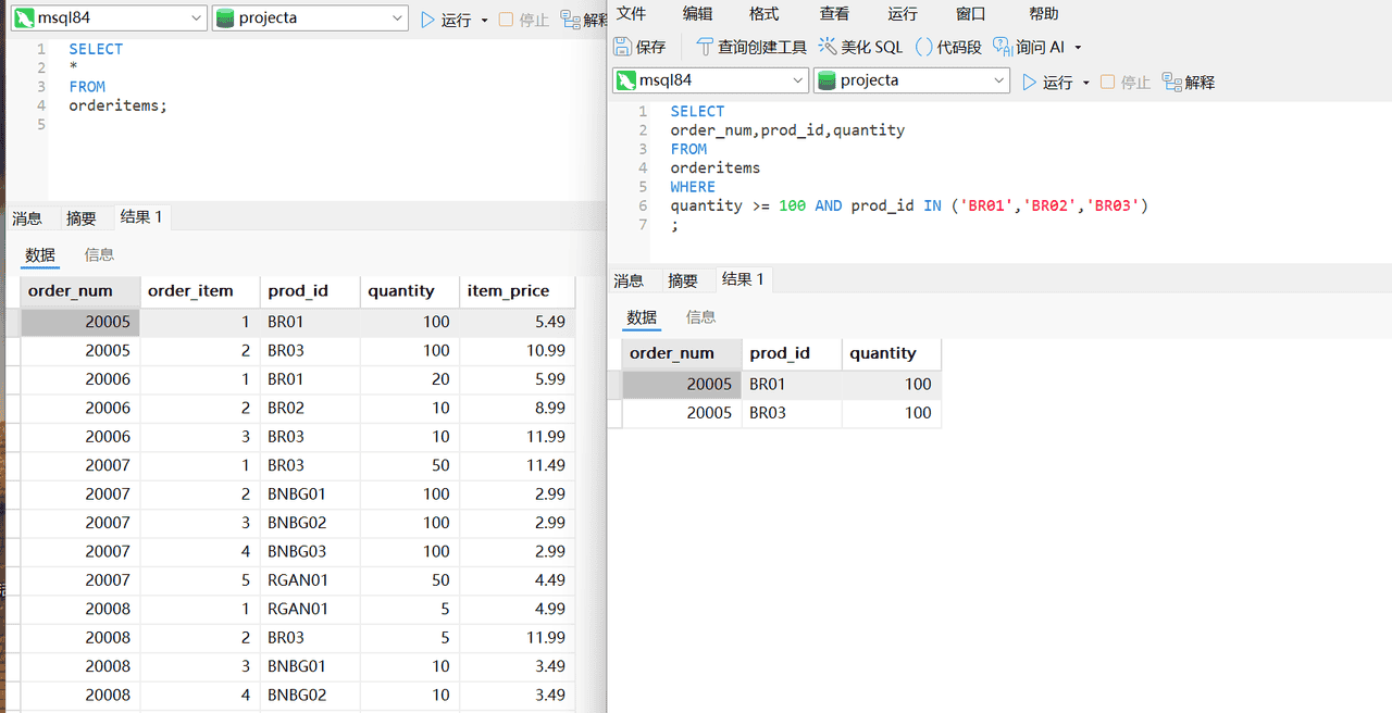 2、编写SQL语句,查找所有至少订购了总量100个的BR01、BR02或BR03的订单。你需要返回OrderItems表中的订单号(order_num)、产品ID(prod_id)和数量,并按产品ID和数量进行过滤。提示:根据编写过滤器的方式,可能需要特别注意求值顺序。