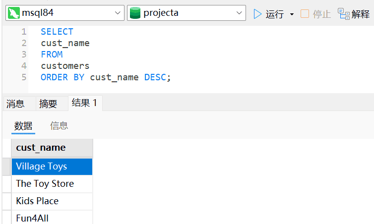 1、编写SQL语句,从Customers中检索所有的顾客名称(cust_name),并按从Z到A的顺序显示结果。