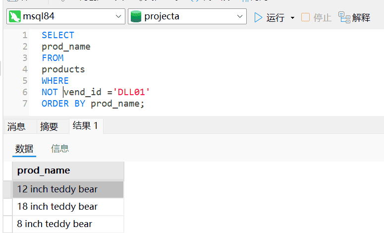 WHERE子句中的NOT操作符有且只有一个功能,那就是否定其后所跟的任何条件。因为NOT从不单独使用(它总和其他操作符一起使用),所以它的语法与其他操作符有所不同。NOT关键字可以用在要过滤的列前。而不仅是在其后。下例子为了列出除了DLL01之外的所有供应商制造的产品: