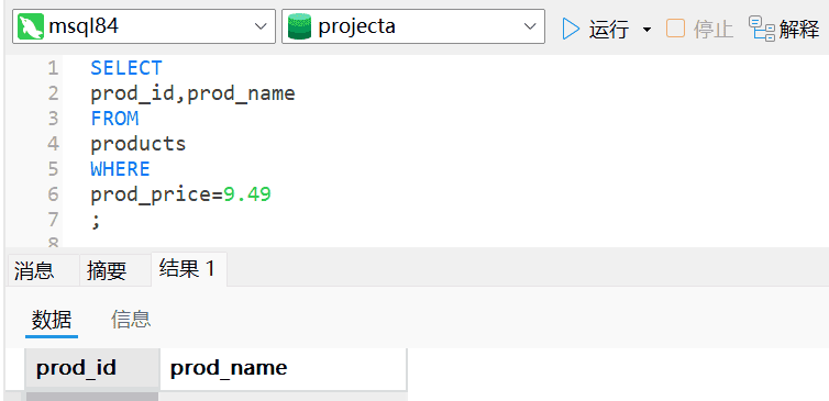 1、编写SQL语句。从Products表中检索产品ID(prod_id)和产品名称(prod_name),只返回价格为9.49美元的产品。
