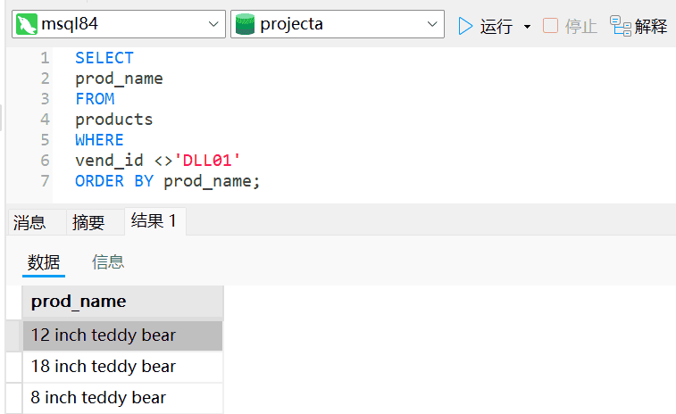 上例DBMS不是匹配vend_id为DLL01,而是匹配非DLL01之外的所有东西。上述例子同样也可以使用<>操作符来完成,如下: