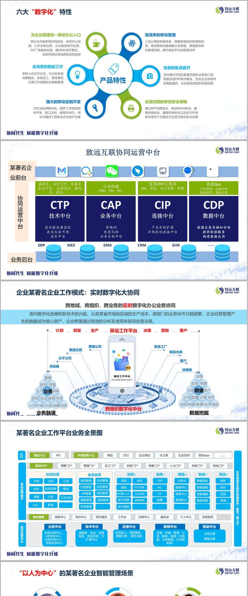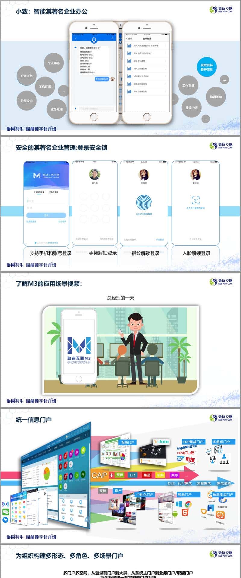 在具体应用场景上,平台实现了跨地域、跨组织、跨业务的实时数字化办公协同,打造了多角色智能管理场景,为企业管理者、普通员工、客户、经销商、供应商等不同角色提供专属功能。M3 作为移动办公协同工具,能分角色呈现信息,通过 CAP 业务中台可定制不同业务 / 职能门户。致信即时消息模式、微协同、小程序、小致智能办公助手等功能,进一步提升了办公效率与协作便利性,同时平台还具备多重登录安全保障。