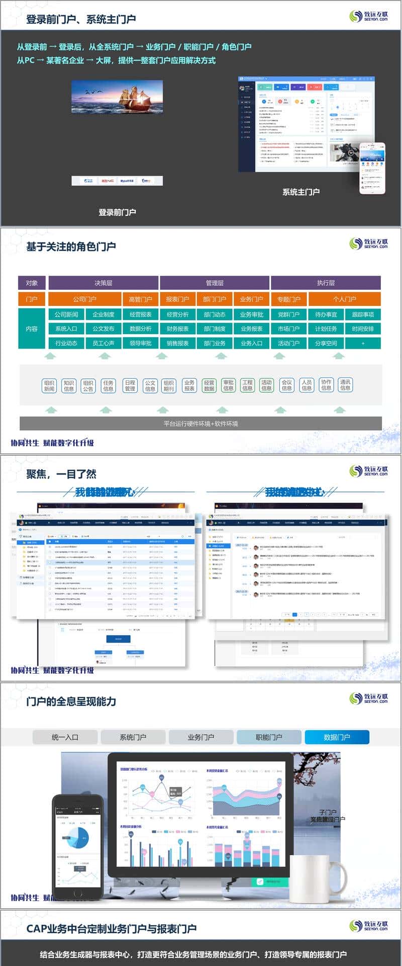 此外,平台在门户建设上,构建了从登录前门户到系统主门户、业务子门户、大屏等多形态、多角色、多场景的门户系统,覆盖新闻公告、业务审批、数据分析等各类需求。在协同管理中心,围绕会议、文化、任务、知识、公文、综合办公等核心模块,提供端到端的管理服务,如会议的全流程无纸化管理、知识的沉淀与分享、公文的规范处理、行政事务的高效协同等。