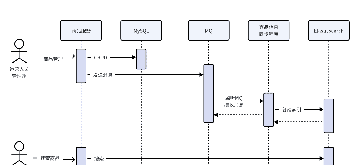 异步方式是通过引入MQ实现,修改商品信息时向MQ发送修改的商品信息,然后监听MQ的程序请求ES向索引写入,流程如下: