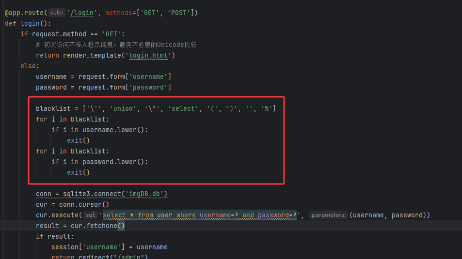 blacklist = [''', 'union', '"', 'select', '(', ')', '', '%']