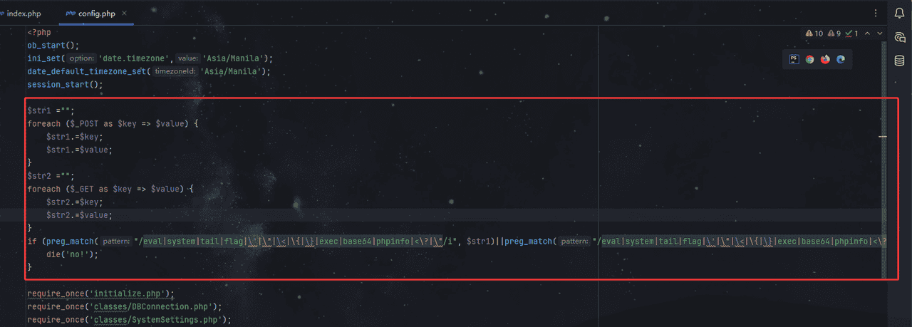 if (preg_match("/eval|system|tail|flag|'|"|<|{|}|exec|base64|phpinfo|<?|"/i", $str1)||preg_match("/eval|system|tail|flag|'|"|<|{|}|exec|base64|phpinfo|<?|"/i", $str2)) {
