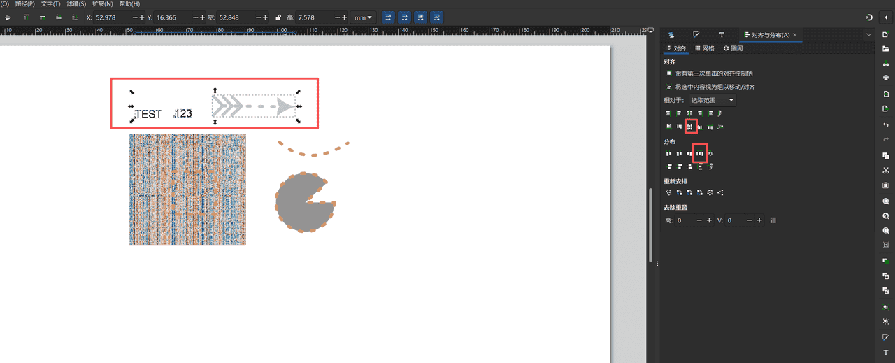 5.对齐分布。选中右边的对齐图标,将多个元素选中,一般水平或垂直居中,并设置均匀间隙分布。