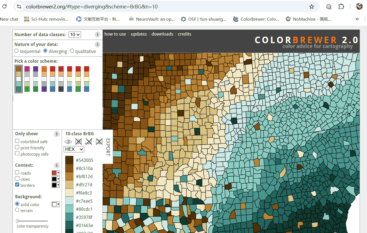 https://colorbrewer2.org/#type=diverging&scheme=BrBG&n=10