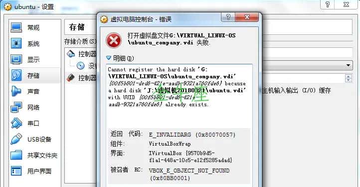 将VirtualBox虚拟机的SATA虚拟硬盘文件夹迁移到闪存设备后,修改VBox中的虚拟硬盘路径保存时提示如下错误信息: