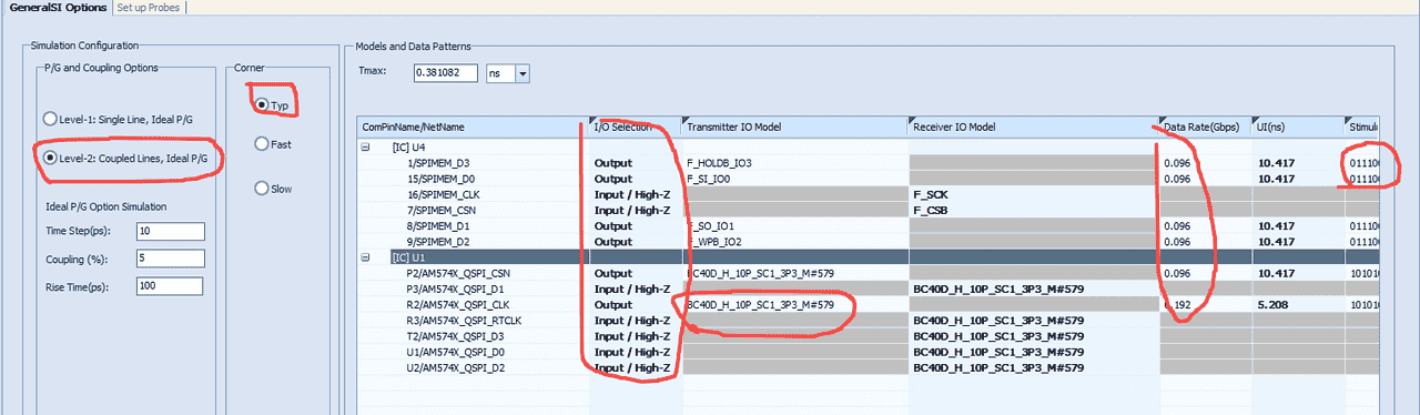 从左到右,依次是需要考虑线间的耦合,仿真典型corner,IO的输入输出按照CPU读取Flash的场景仿真,IO模型的选择上Flash只有一种而CPU有很多,选取一个慢速的3P3是3.3V的模型,数据速率按照手册上的最大速率96Mbps,这里单位是Gbps,但是对于时钟信号每个周期是两个bit,算成bps要翻倍;激励数据波形至少采用PRBS5_含补码的01110010001010111101101001100001000110111010100001001011001111,时钟和CSN信号就用01010101的数据就行了,注意数据末尾的两个点…表示数据重复,不要丢掉了。仿真时间至少覆盖一个完成的62bit,一个UI是10.4,设置稍大一点800ns。完整设置如下,时间未改,按自己喜好改: