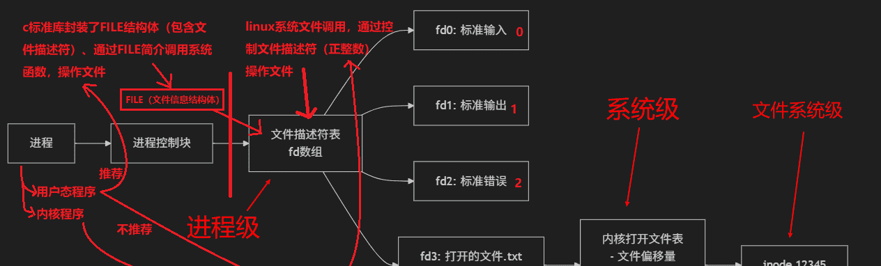 进程级:文件描述符表(每个进程独立)系统级:打开文件表(全局,记录当前打开文件状态)文件系统级:inode表(持久化存储元数据)下面的图结合linux内核模块程序、普通用户态程序对文件操作进行了细致说明: