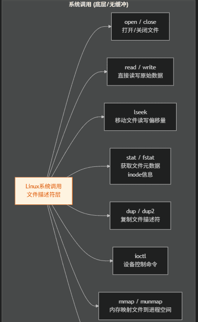 需要引入的头文件根据对应的函数而不同,标准库文件操作只需要一个头文件,这也是linux系统调用文件操作和标准库文件操作的区别之一。Linux 系统调用(<unistd.h>/<fcntl.h>)直接操作文件描述符(FD),无缓冲机制,效率更高,是底层开发(如服务器、驱动)的核心,与之前讲的文件描述符底层机制强关联。linux文件操作都有哪些函数: