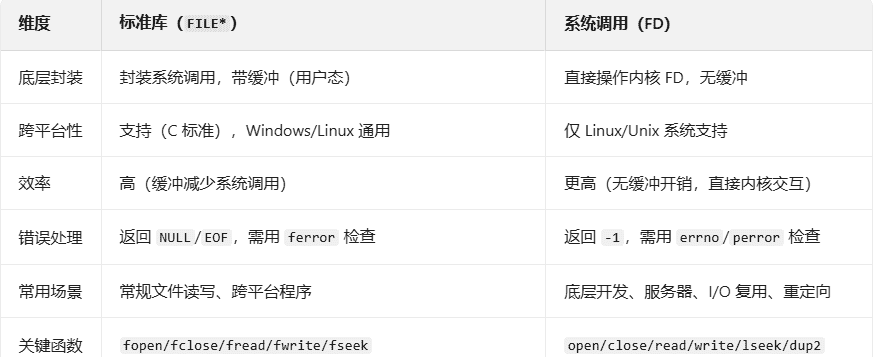 标准库是用户态封装,核心优势是跨平台和缓冲;系统调用是内核提供的底层接口,无缓冲、效率高,适合 Linux 特定场景(如服务器开发)。实际开发中,常规场景用标准库,需要精细控制(如非阻塞 I/O、重定向)时用系统调用。