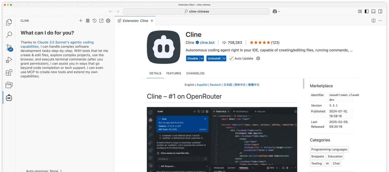 说干就干,花费大约3个小时,我完成了项目的汉化工作,全程只解决了一些不适合翻译的代码变量被翻译成中文的问题之外,没有做太多的干预。随后又在大模型的指导下,学会了如何打包插件并发布到VS Code市场。并将项目在GitHub上进行了开源(github上搜cline chinese)。