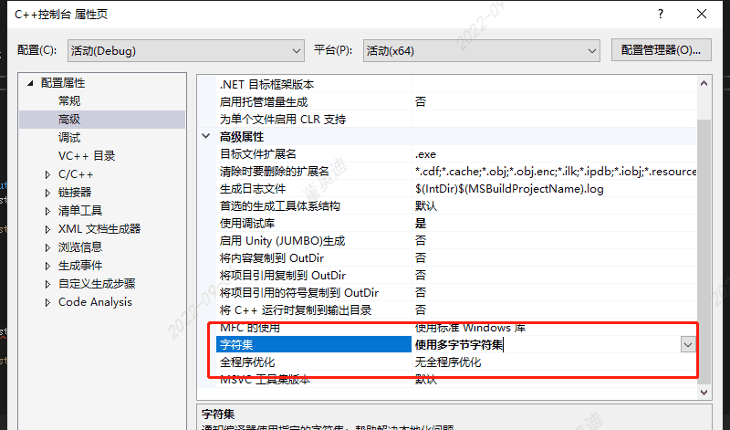 如果遇到这两行代码报错的问题,是因为项目的编码方式选择了unicode,右键项目->属性->高级 将编码方式切换为多字节字符集即可。
