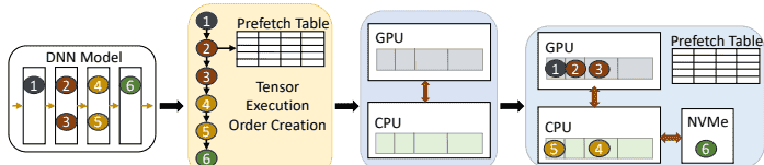 张量特征分析器:预跑模型一次,记录每个张量的执行顺序、大小和活跃时间,生成“预取时刻表”。缓存分配器:预分配固定大小的内存缓冲区(如512B、1KB块),复用这些缓冲区避免重复分配开销,并采用CPU固定内存加速传输。张量分配器:根据内存容量动态分配张量位置——优先驻留GPU,次选CPU,最后NVMe。预取-驱逐调度器:在GPU计算时异步迁移数据,例如在前向传播中提前加载下一层张量,并淘汰已用张量。