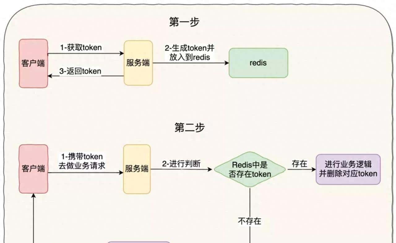 - 服务端会校验这个 token,如果校验成功,则执行业务,并删除 redis 中的 token