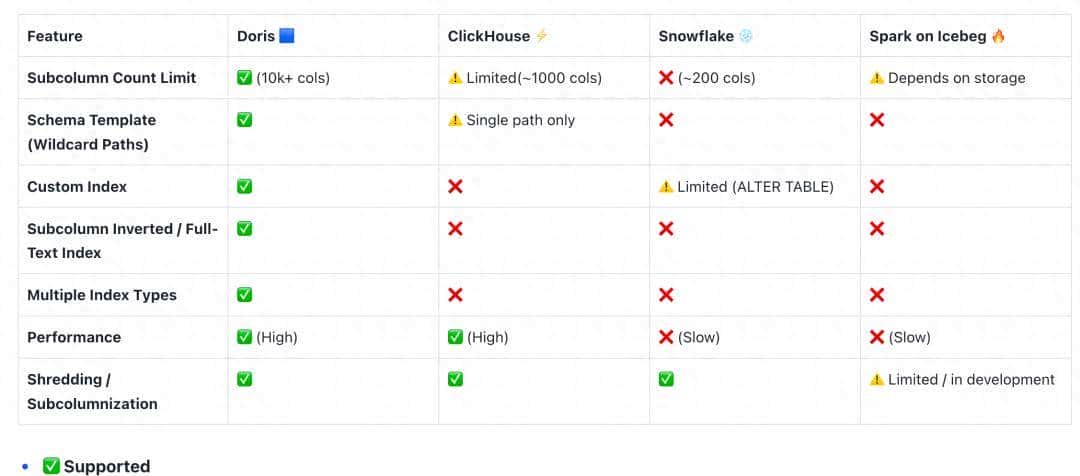- 稀疏列 :对于出现频率极低或结构复杂的稀疏子列,不为其创建独立子列以避免列爆炸。相反,这些数据会被高效组织在一个类 JSONB 的二进制“稀疏”列中,保留完整数据而不为罕见字段额外建列。