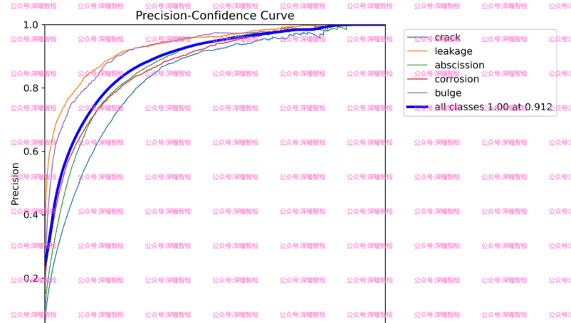 图中的深蓝色折线代表整体的精度,随着置信度的增加,精确度也增加,在置信度为固定取值时,精确度达到了1.00。其余几条线分别表示各个类别在不同的置信度下的精度。