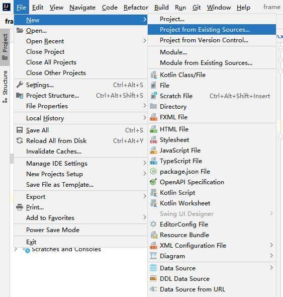 - File->New->Project from existing Sources…