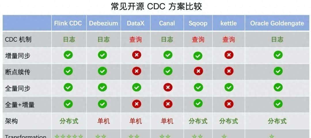 - 在全量+增量一体化同步方面,只有 Flink CDC、Debezium、Oracle Goldengate 支持较好。