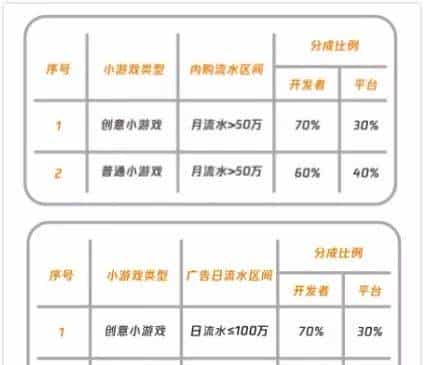 在这两个计划之外,微信提供的应收转投放和应收预提将帮助开发者快周转。同时对普通开发者的抽成比例进一步降低。月流水 50 万以下的小游戏免抽成。月流水在 50 万以上的部分,游戏内购抽成 40%;日流水在 100 万以下的部分,广告抽成 50%。