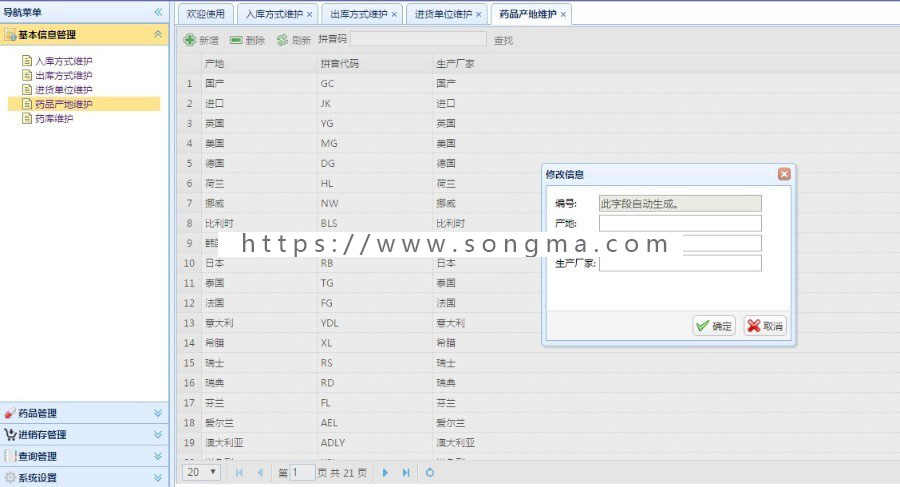 1. 基本信息管理:维护数据库中基本的外键表,保证数据的参照完整性。有入库、出库方式维护、进货单位维护、药品产地维护、药库维护。