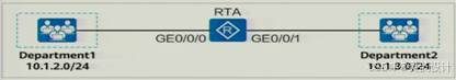 多选879、如图所示,RTA的GE0/0/0、GEO/0/1接口分别连接部门1和2,其网段分别为10.1.2.0/24、10.1.3.0/24网段,为限制部门1和2之间的相互访间,在RTA上部署traffic—flter,以下哪些部署方式是正确?