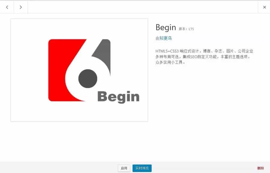 Begin主题详细功能HTML5+CSS3响应式设计 兼容IE8+、Firefox、Chrome等现代浏览器。 杂志布局、图片布局和博客布局后台切换首页幻灯,并可自定义链接。 文章列表ajax滚动加载 评论ajax提交评论ajax分页 图片及留言头像延迟加载 选择Gravatar头像获取方式评论回复邮件通知 功能强大的主题选项面板 关注我们小工具大家喜欢小工具 带缩略图的最新文章小工具 带缩略图的本站推荐文章小工具热评文章小工具 热门文章小工具 热门标签小工具相关文章小工具 读者墙小工具 带Gravatar头像近期留言广告位小工具 推荐文章(无缩略图)小工具 不同页面显示不同的侧边栏随机文章小工具 blog页面模板 在线代码高亮转换页面模板友情链接页面模板 文章归档页面模板 淘客商品页面模板热门标签页面模板 用户中心页面模板 用户注册页面模板百度站内搜索页面模板 给我投稿页面模板 联系方式页面模板最近留言页面模板 通栏专题页面模板 随机文章页面模板分类使用图片布局 分类杂志专题模板 显示全部子分类模板企业主页 文章设置面板 图片lightbox查看视频lightbox播 评论关闭不显示提示文字 禁止冒称管理员留言首页排除指定分类文章 最新文章角标提示 集成响应式分页导航文章编辑器增强 后台文章编辑样式与前端相同 功能全面的SEO自动缩略图 支持特色图像功能 集成百度站内搜索集成百度分享 前台登录 前台注册并登录短代码文字折叠 短代码下载链接按钮 短代码文章插入图片幻灯短代码添加视频 短代码回复可见 集成代码高亮显示集成PC及移动广告位 支持图像、日志、软件(引用)文章形式 键盘方向键翻页支持菜单功能 支持背景功能 评论添加表情与图片字号缩放按钮 集成点赞按钮 集成赞助按钮隐藏侧边栏开关 自定义文章类型:公告、相册图片、商品 、视频 滑动解锁提交关注微博按钮 评论等级 集成注册邀请码外链接自动链接跳转 font awesome图标字体 用户上传本地头像短代码密码保护文字 3D标签云 自动生成当前页二维码文章目录索引 禁止非管理员进入后台 文章自动添加标签链接禁止冒充管理员留言 页面链接添加.html后缀 分类归档页面链接添加斜杠后缀自动为文章添加标签 百度主动推送 热门文章页面模板试试手气页面模板更新日志