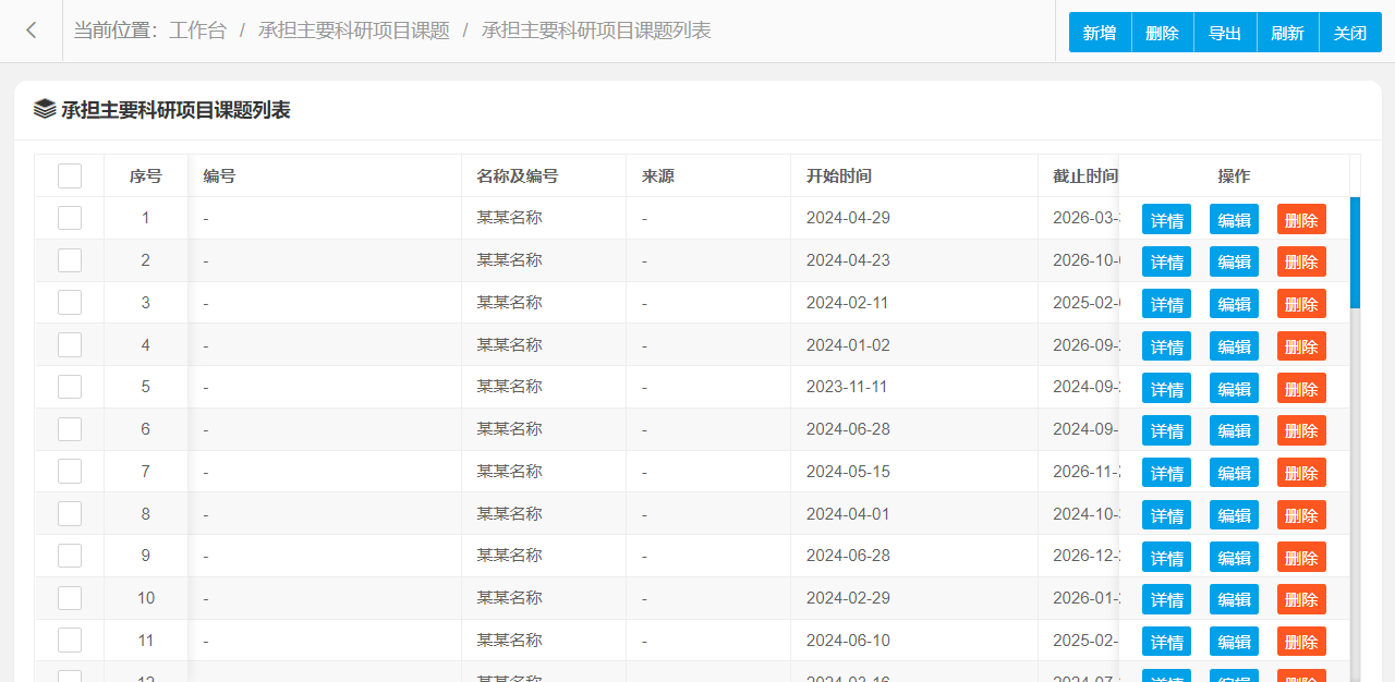 承担主要科研项目课题管理功能主要字段信息包含:编码、编号、名称及编号、来源、开始时间、截止时间、经费(万元)、排序等。使用表格形式展示数据信息,方便用户查看和编辑。