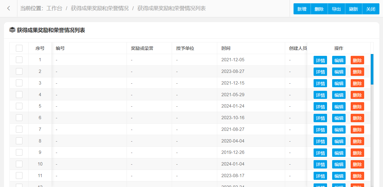获得成果奖励和荣誉情况管理功能主要字段信息包含:编码、编号、奖励或荣誉、授予单位、时间等。使用表格形式展示数据信息,方便用户查看和编辑。