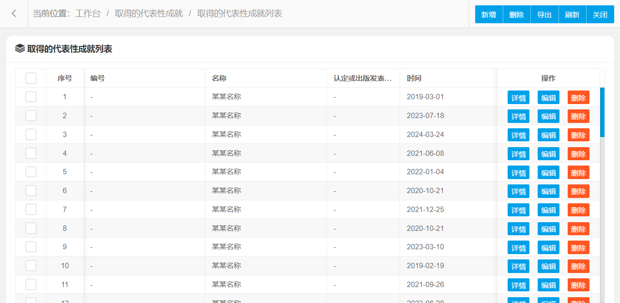 取得的代表性成就管理设置新增、编辑、删除、条件搜索、查看详情等操作,可按照页面提示进行操作执行,界面结构设计简单,操作流程简洁明了,可提升用户操作体验。