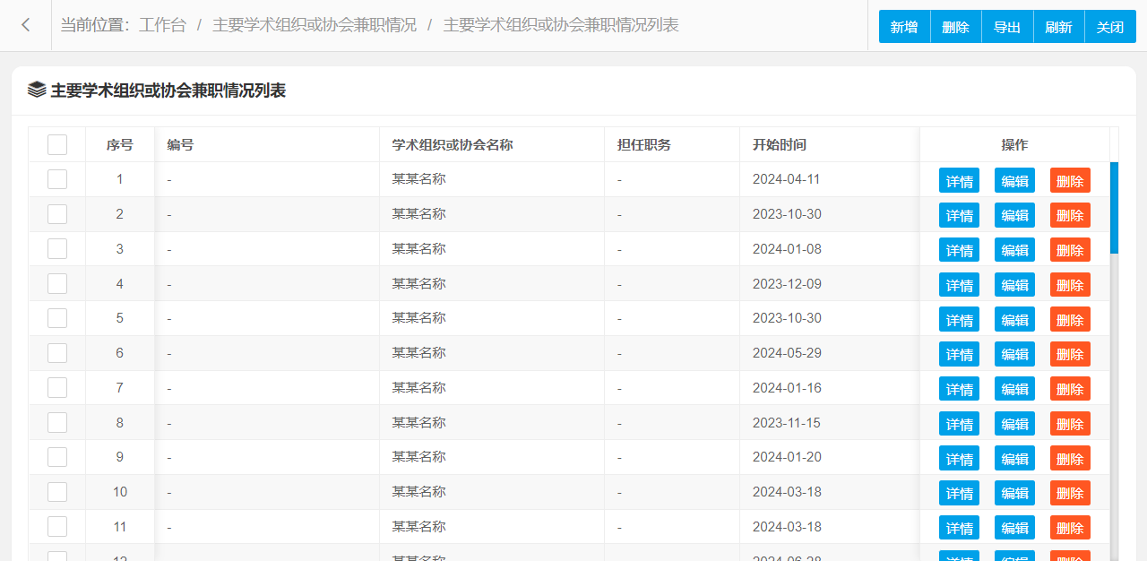 主要学术组织或协会兼职情况管理功能主要字段信息包含:编码、编号、学术组织或协会名称、担任职务、开始时间、截止时间等。使用表格形式展示数据信息,方便用户查看和编辑。