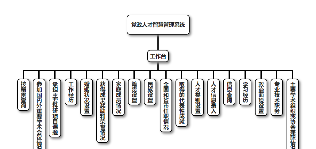 工作台包含:按籍贯查询、参加国内外重要学术会议情况、承担主要科研项目课题、工作经历、婚姻状况设置、获得成果奖励和荣誉情况、家庭成员情况、籍贯设置、民族设置、全国和省市任职情况、取得的代表性成就、人才类别设置、人才信息录入、信息查询、学习经历、政治面貌设置、专业技术职务、主要学术组织或协会兼职情况,根据不同角色权限菜单展示会有所区别。