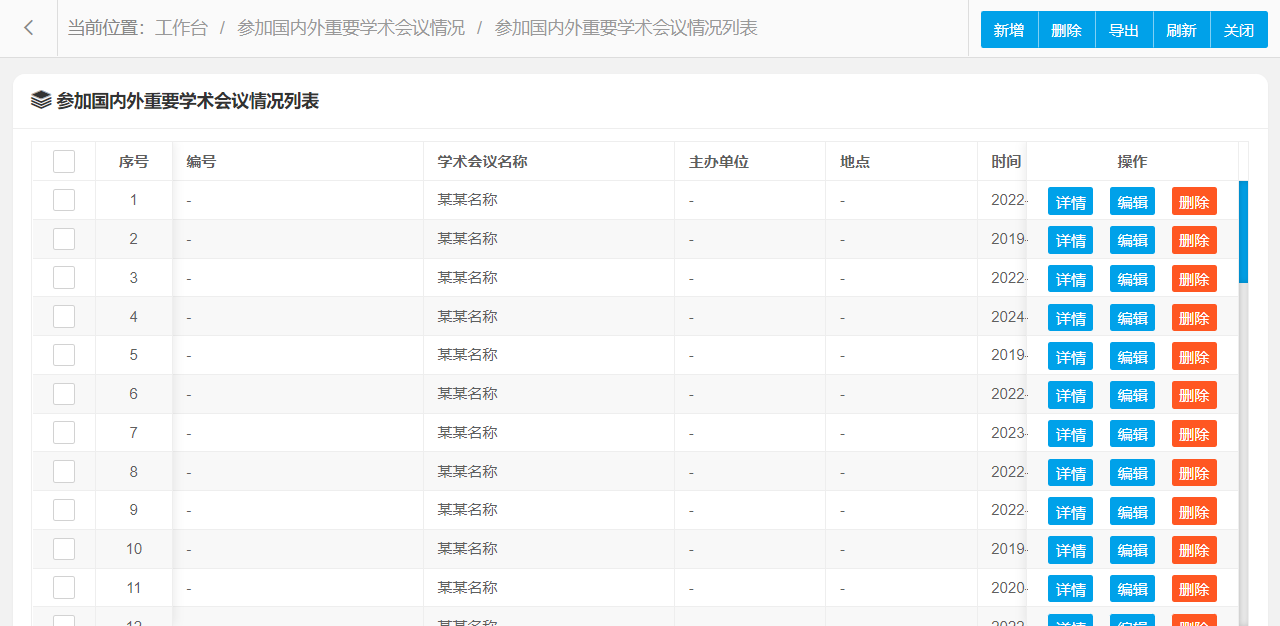 参加国内外重要学术会议情况管理设置新增、编辑、删除、条件搜索、查看详情等操作,可按照页面提示进行操作执行,界面结构设计简单,操作流程简洁明了,可提升用户操作体验。