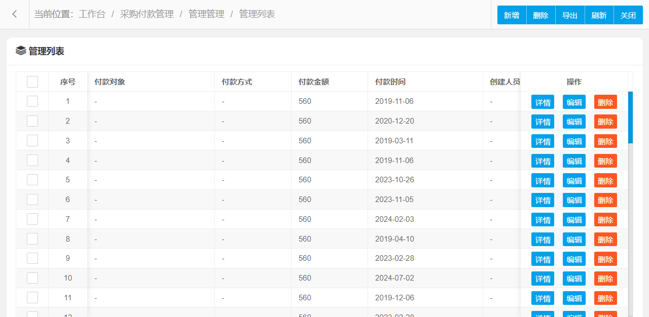 管理功能主要字段信息包含:管理编码、付款对象、付款方式、付款金额、付款时间、备注等。使用表格形式展示数据信息,方便用户查看和编辑。
